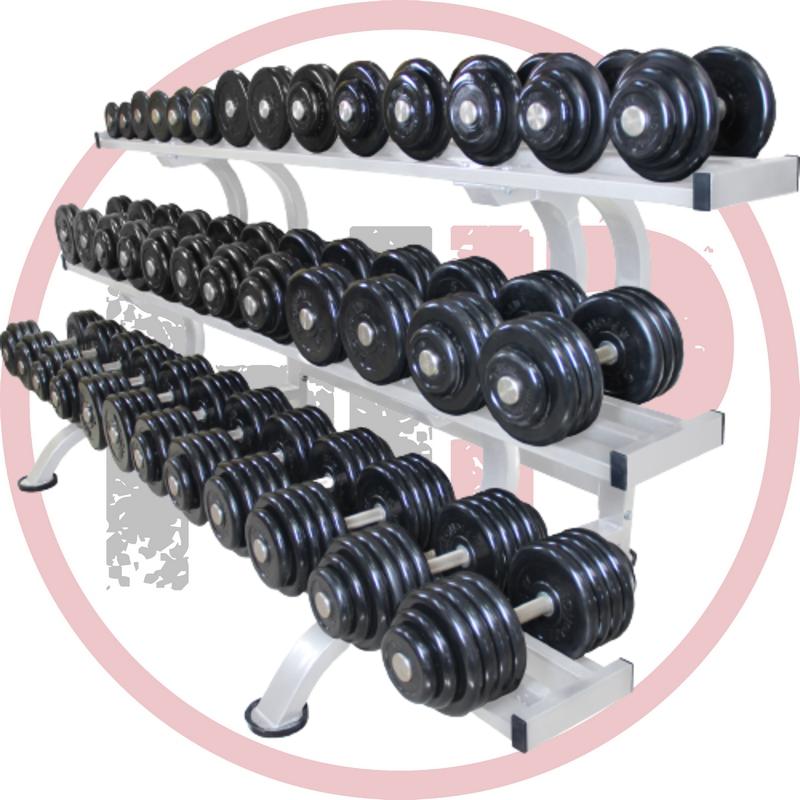 Набор неразборных обрезиненных гантелей на трёхрядном стеллаже длиной 260 см. Гантели составлены из обрезиненных дисков Антат, ручки вращающиеся хромированные. Надежное крепление дисков на грифах обеспечивает полную безопасность и комфорт тренировок.