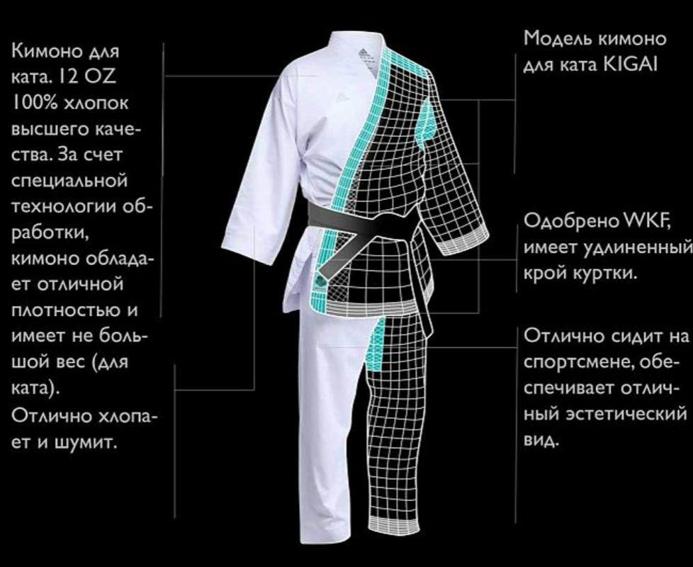Модель KIGAI для ката от компании adidas, достаточно легкое для спортсмена при этому обеспечивающее отличный шум, состоящий из куртки и брюк с длинным покроем рукавов и штанин с традиционным шнурком. Кимоно сделано из 340 gr/m2 (12 унций) материал 100% хлопок высшего качества, обработанного специальной антибактериальной пропиткой по технологии adidas, которая улучшает впитывание влаги, обеспечивает быстрое высыхание и предотвращает появление неприятного запаха и образование бактерий. Имеет предварительную усадку по технологии Pre-shrunk. Кимоно одобрено Международной федерацией каратэ WKF (World Karate Federation). Детали: длинный покрой рукавов и штанин, брюки на кулиске. Материал: 100 % хлопок высшего качества.
