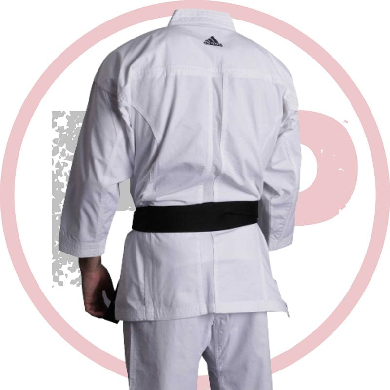 Кимоно для карате от компании Adidas состоит из рубашки и брюк. Эта модель легкого кимоно предназначена для профессиональных игроков, используется национальными сборными. Просторная рубашка с запахом, боковыми разрезами и длинными рукавами-кимоно изготовлена из плотного материала. В создании использовалась технология ClimaCooL для обеспечения оптимальной вентиляции. Вдоль спины, по всей длине, вшита вентиляционная вставка из сетчатого материала. Брюки удерживаются на поясе спортсмена при помощи шнура и широкой вшитой резинки. По всей длине штанины внутренний шов заменен вставкой шириной несколько сантиметров. На пояснице имеется вентиляционная вставка из сетчатого материала. Кимоно для карате Adidas Kumite одобрено WKF (Word Karate Federation), имеется специальная нашивка.